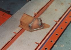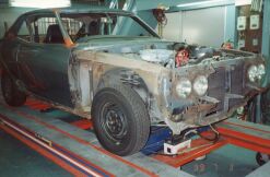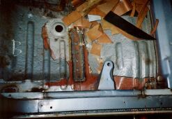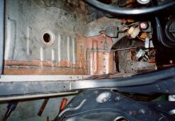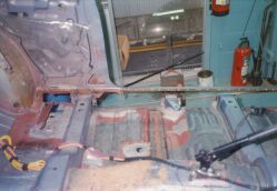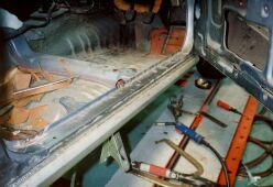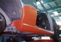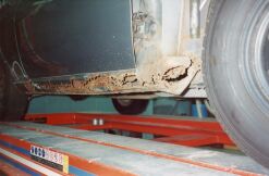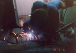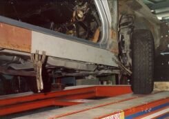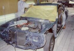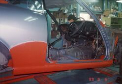 大阪市平野区の某板金屋にセリカを持ち込み、以後4ヶ月ほどかけて板金、塗装を行った。このページでは腐食が激しかった運転席側のサイドステップにスポットを当てるが同様の作業を助手席側サイドステップ、トランク下側を含め車全体に対して行った。板金というよりも車一台作り直したような印象を受けた。板金屋さんも商売であり、回転の速い仕事を優先させるため2ヶ月ぐらい遅々として作業がはかどらない状態が続いていたが、お中元攻撃が功を奏して梅雨明けぐらいから急ピッチで進んだのであった。 他方、この間に友人であり整備工場従業員のT氏による部品かき集めが同時並行的に行われていた。