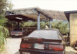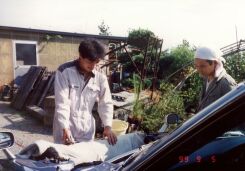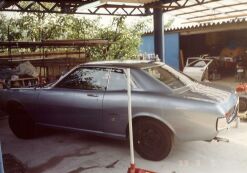 板金屋からT氏が運び出したセリカと ご対面。手前は愛車、三菱スタリオン 平成11年9月5日 Y邸