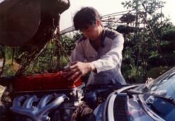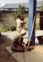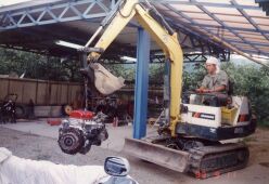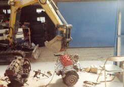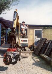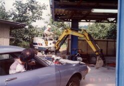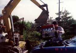 平成11年9月11日 エンジン取付完了 ユンボで引っ張ってガレージに戻す。