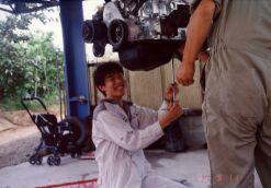 エンジンルームを前に綿密な 打ち合わせを行うT氏とY氏